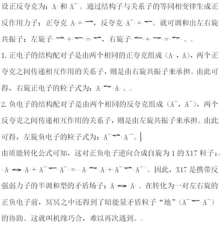 从X17滚动为一双正负电子,且分离角度着实以火去蛾中来看,咱们揣摸这对正负电子所佩戴的共振子,应该是一个右旋,另一个是左旋。加之X17自旋为1,就可料定在这对正负电子中,正电子佩戴右旋共振子,负电子佩戴左旋共振子。而正负电子齐是由正反夸克配对组合成的结构配春联,以及结构配春联之间传递互相作用的联系子两个构件构成。