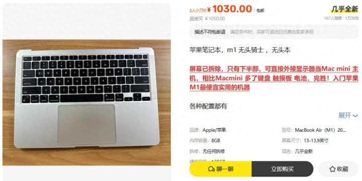 先给不熟谙的一又友讲明一下啥叫无头骑士。即是札记本屏幕坏了,或者卖家把屏幕拆了当配件卖,剩下的主体部分还能平时开机,接上外接披露器就能用。这台是2020款的M1 MacBook Air,畴昔发布时7999起,当今屏幕废了卖1030,听着确乎诱东说念主。