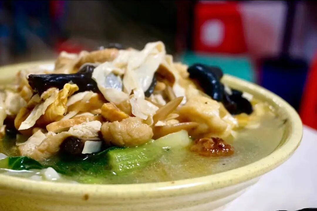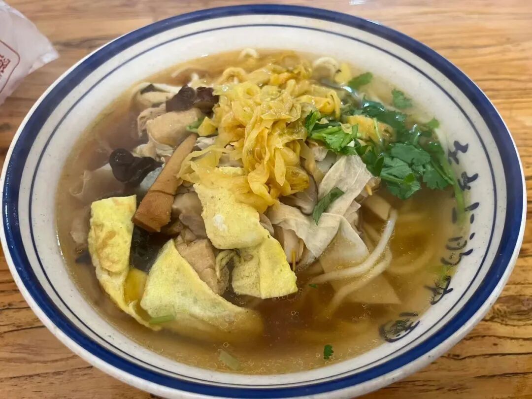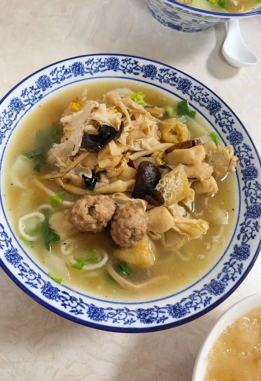 胡萝卜和小青菜同煮,豆腐皮与豆腐干皆飞,再放些鸡蛋、肉圆、金针,柔韧的面条吸满了浓醇的汤汁,嗦上一大口,软润劲说念,满嘴留鲜。