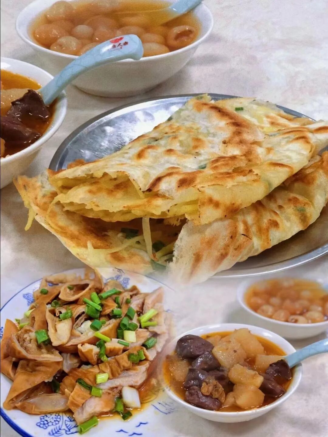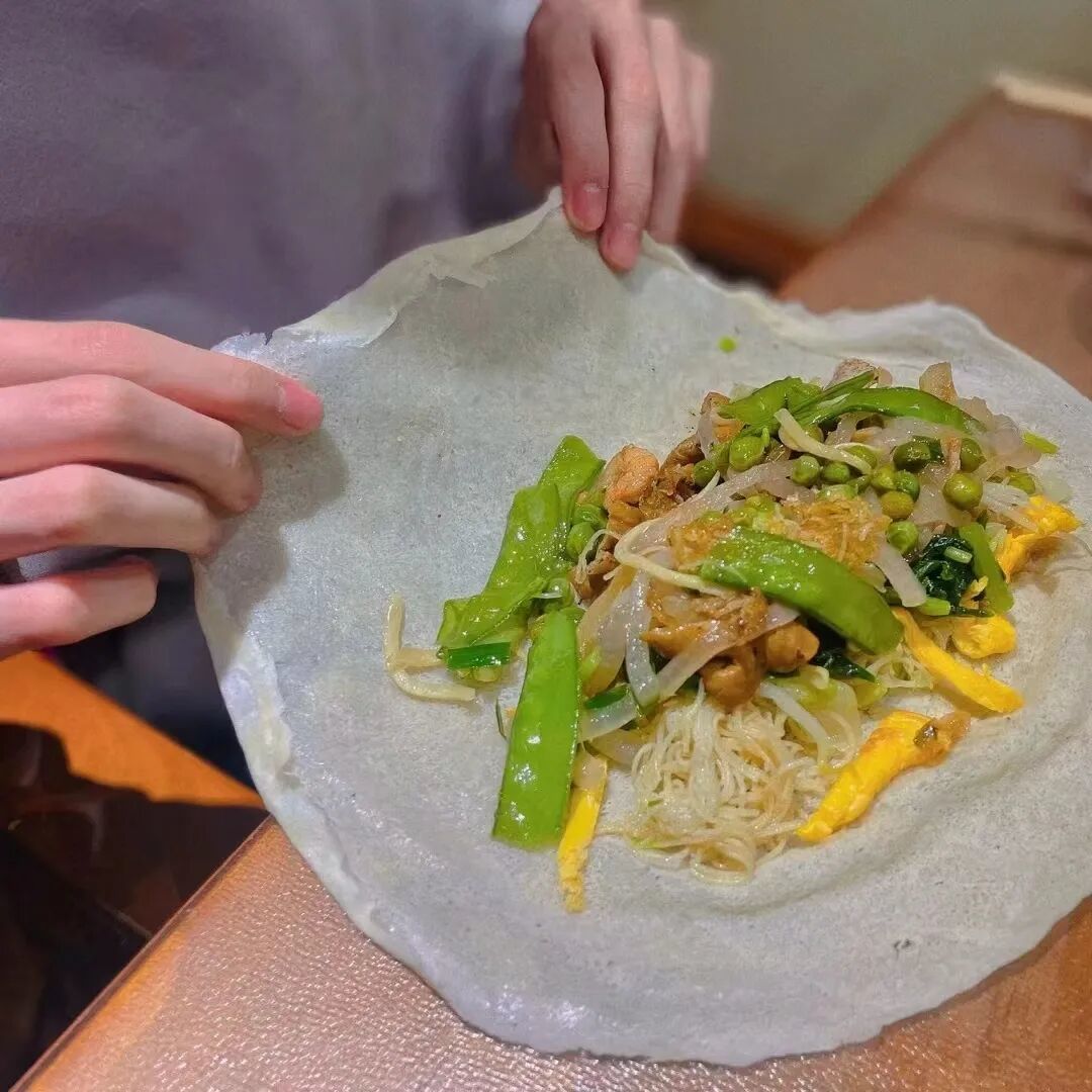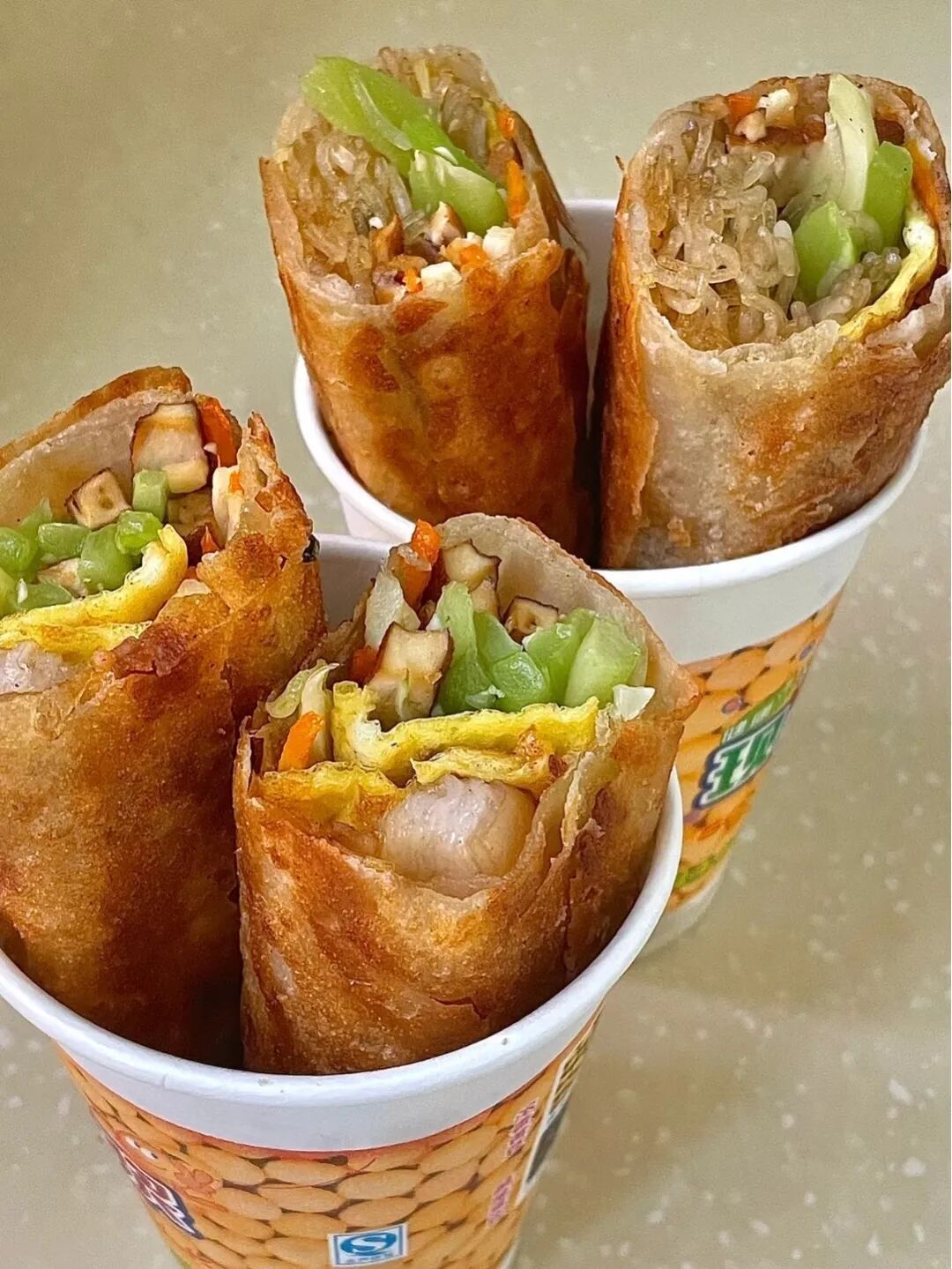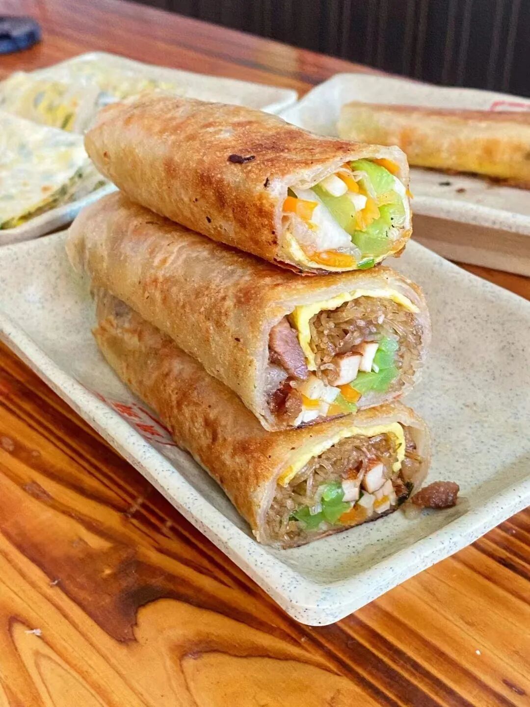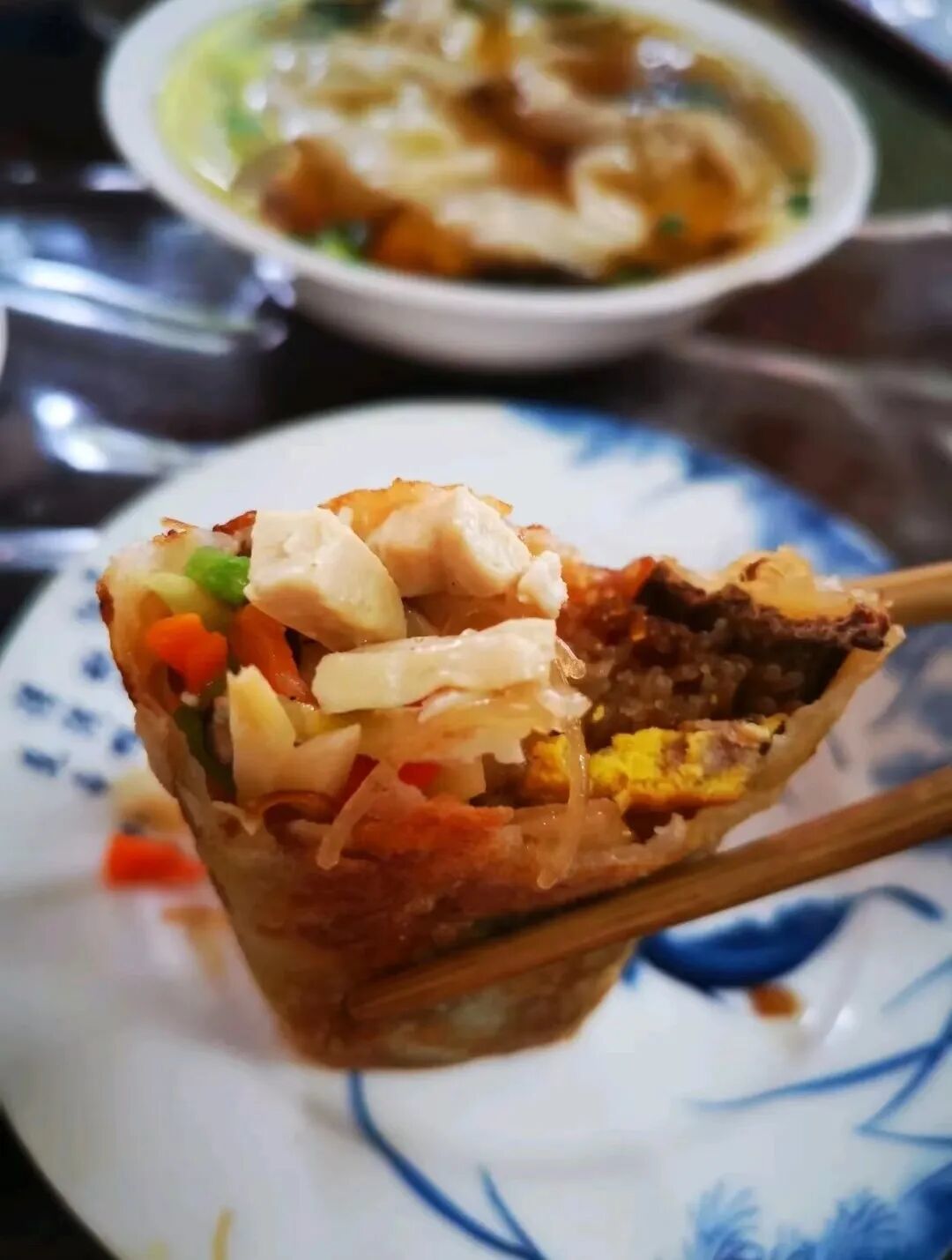 在家吃饺饼筒的状态就更大了,时时会炒上十来说念菜,肉圆膏、鸡子膏、煎豆腐、肥肉片、猪肝片……一口下去,满是面皮的焦香和馅料的爽朗。