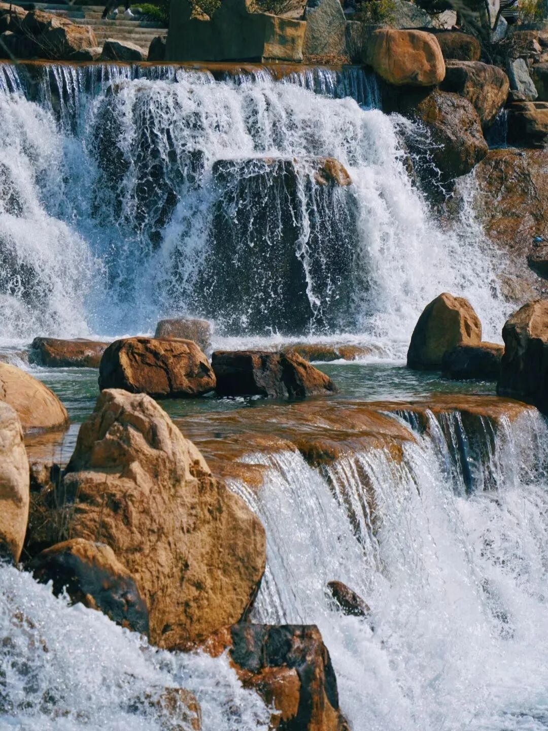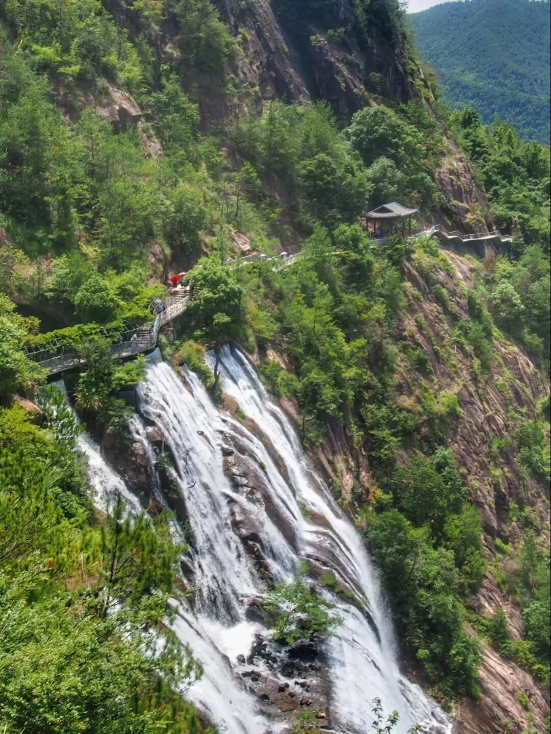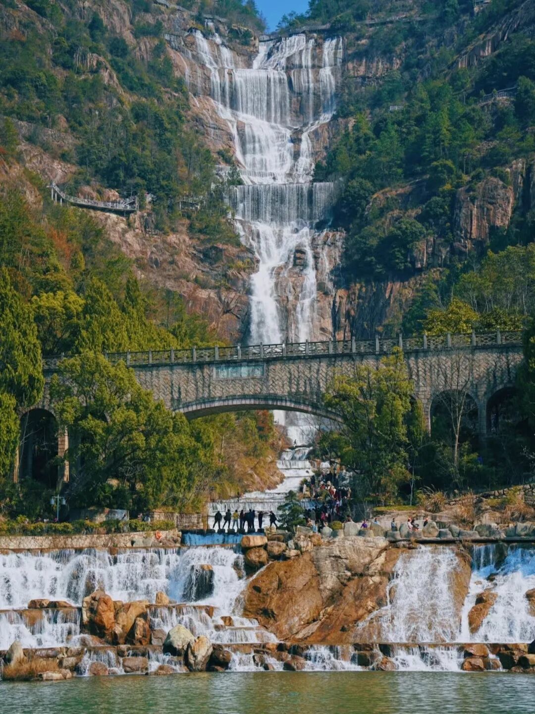 站在山间的长桥上,目下是连绵连续的水流荡下,死后是巍峨苍翠的山崖兀立,微凉的水雾扑过脸颊,轰鸣的水声响彻耳畔,像极了仙侠故事里的场景。