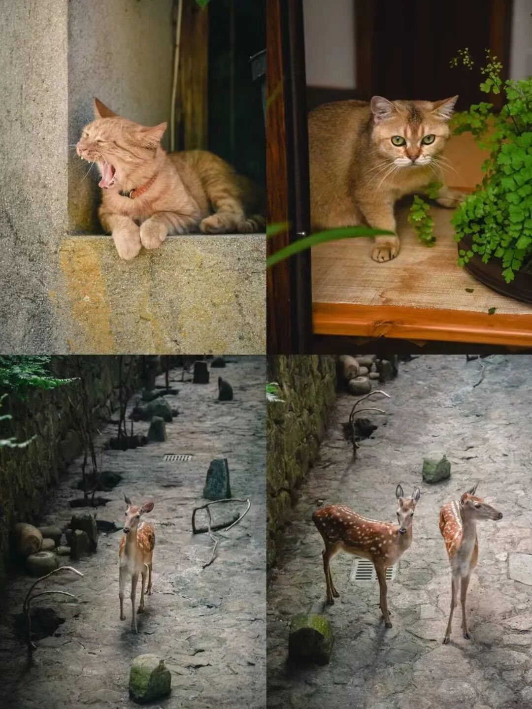寺庙里还收养着不幼年动物,有猫咪倚在石阶上晒太阳,有狗狗在门前犹豫摇尾,有小鹿自山径间悠悠走过,带着几分气定神闲,似是隐隐自有灵性。