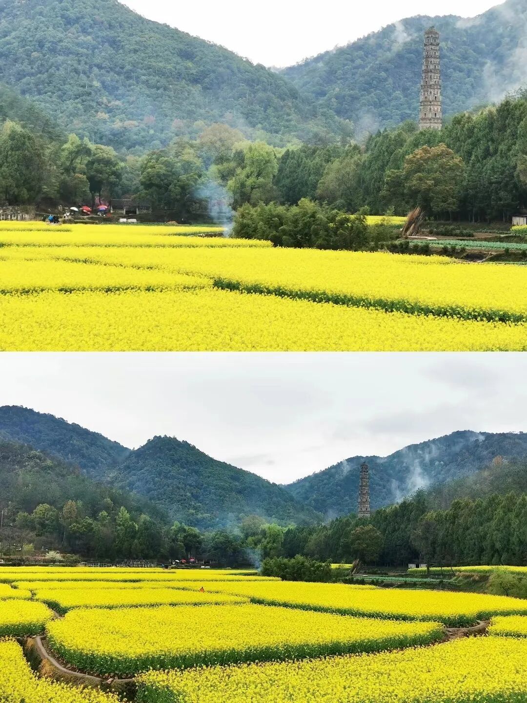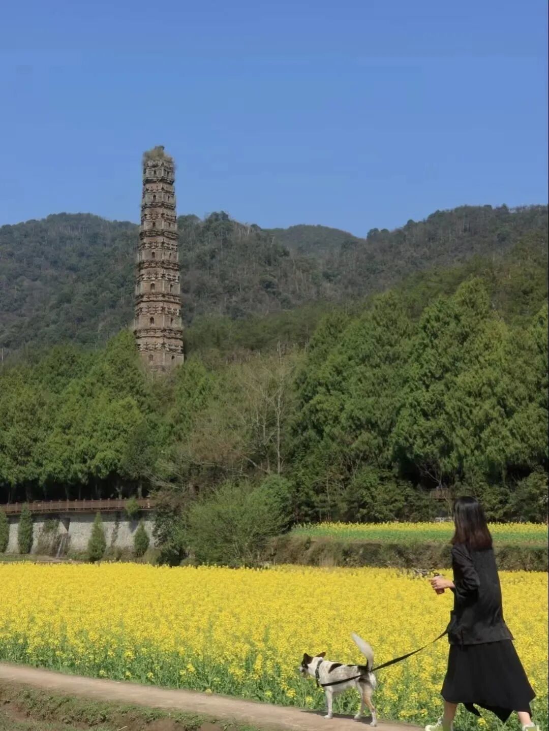 目下是一大片金黄灿烂的油菜花,近处是山脚长廊间的串串紫荆,迢遥是遥遥兀立的千年隋塔,微风一吹,阵阵花香就在鼻尖盈动。