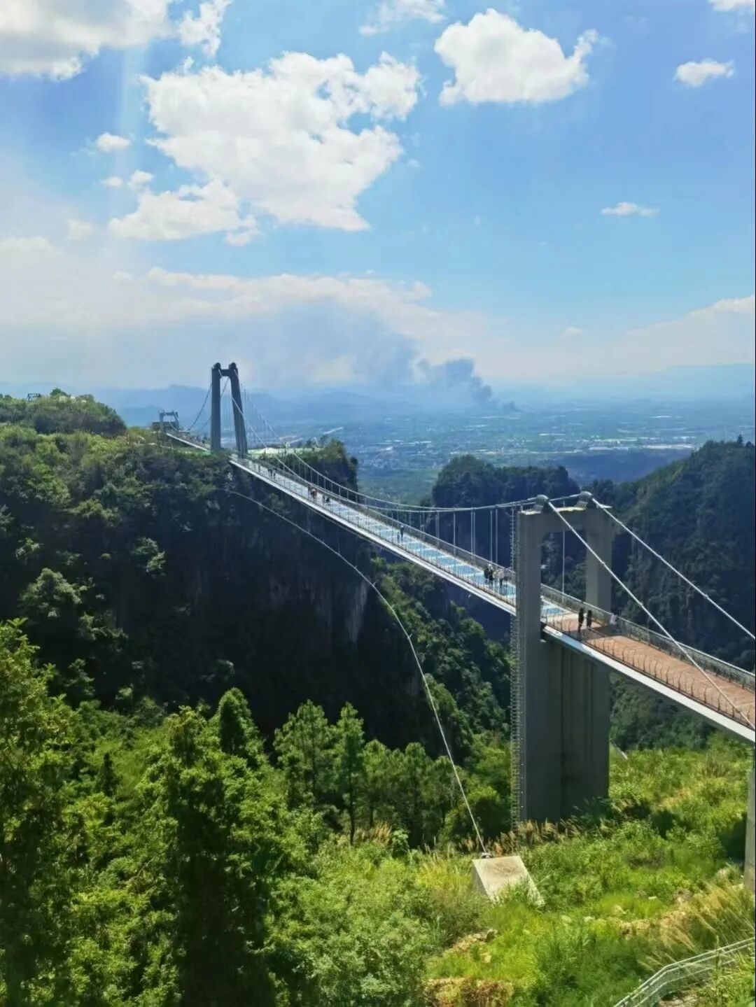 而在山顶还有国内首座双跨玻璃悬索桥——会仙桥,眼下就是邑邑苍苍的山谷,晴时有满眼绿意,雨时有潸潸缭绕,仿佛行走在瑶池之间。