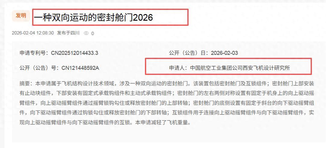这份专利发表在了中国国度学问产权局官方网站上,泰斗性毋容置疑。它属于公开的发明专利肯求,肯求东说念主则来自于中国航空工业集团下属的专科商议单元。明确点说,即是中国航空工业集团公司西安飞机蓄意商议所。动作运-20等多款机型的研发中枢单元,其业界的地位是公认的。