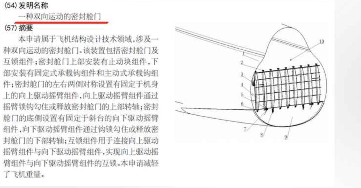 这份专利,全文围绕“双向表示密封舱门”偏执配套撑握机构张开形色,提到所有这个词这个词舱门结构,包含密封舱门执行和互锁组件两部分。舱门不错大角度上翻开启,但高压差环境下的气密性很好。互锁组件为精密铰接机构,落魄部装有承载钩,两侧及底侧的运行摇臂组件可齐备双向表示,舱门依靠多点液压、电动运行。无疑,这套蓄意与大型计策输送机高度筹划。