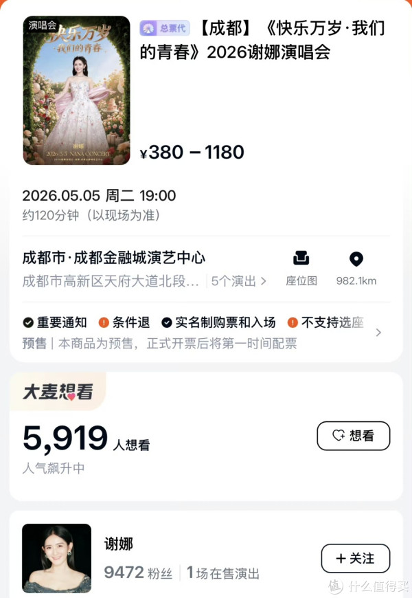 4月11日,谢娜在《乘风2026》直播中顿然官宣:5月5日将在成王人举办个东谈主首场演唱会,主题为“纵脱万岁·咱们的芳华”。票价分为六档,从看台380元到内场1180元不等。