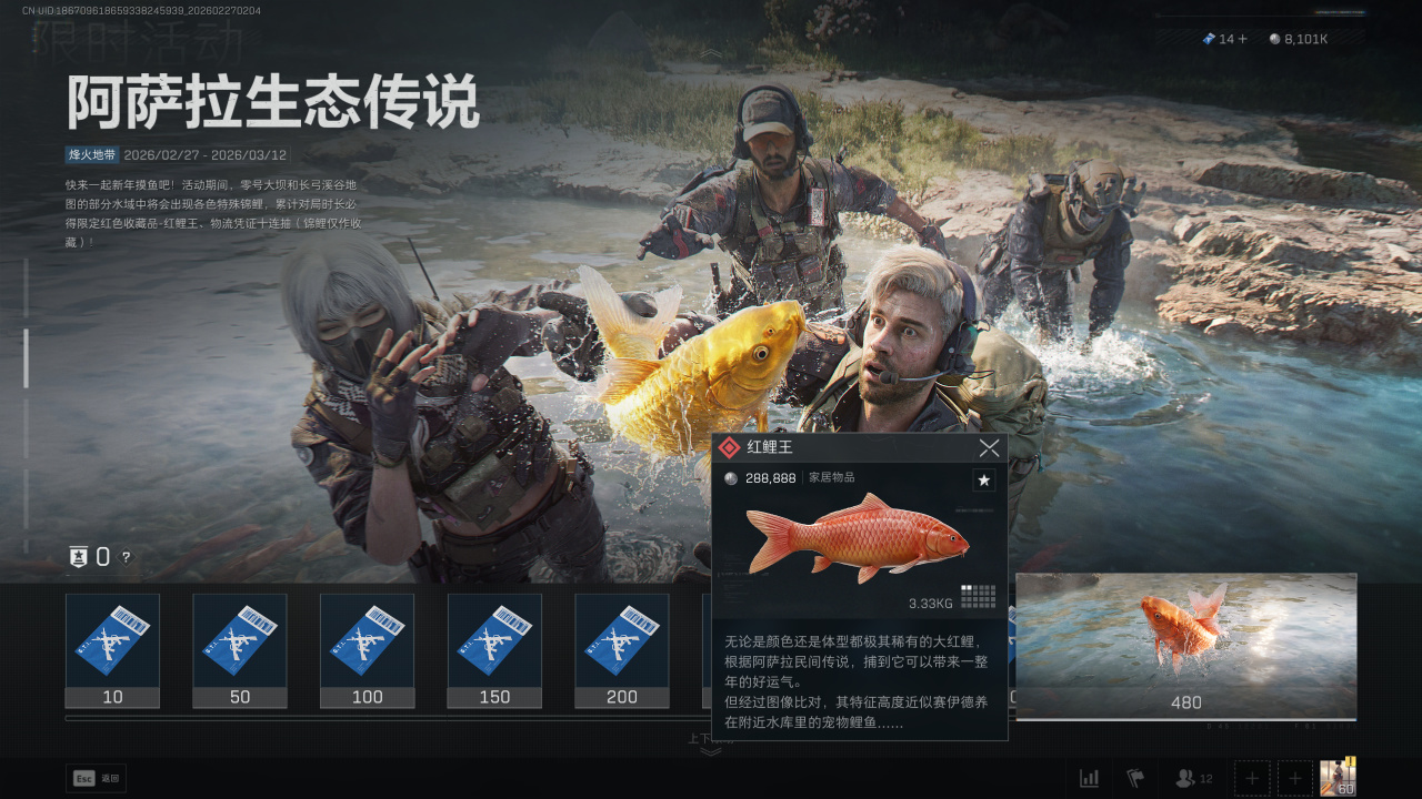鲤鱼共有蓝色 紫色 金色 红色四种品性,在线技艺达到480分钟即可领取最高品性红色鲤鱼王