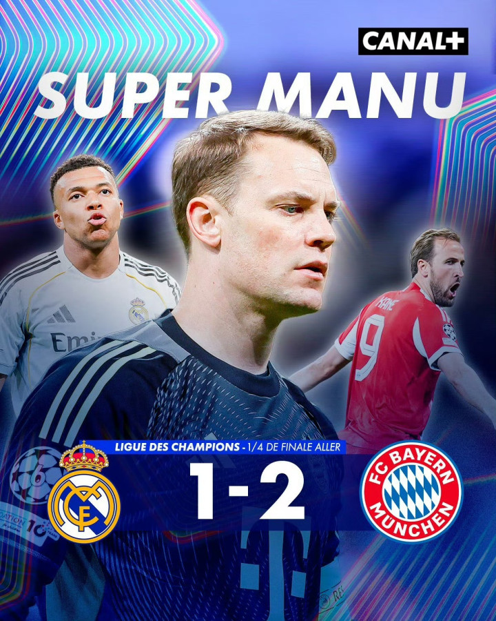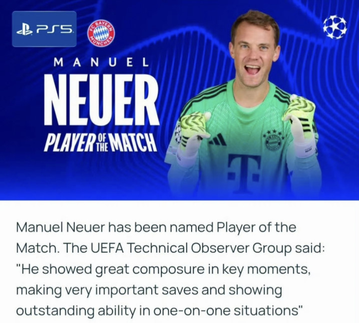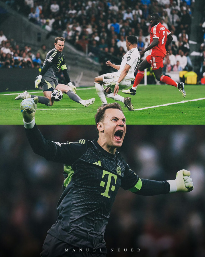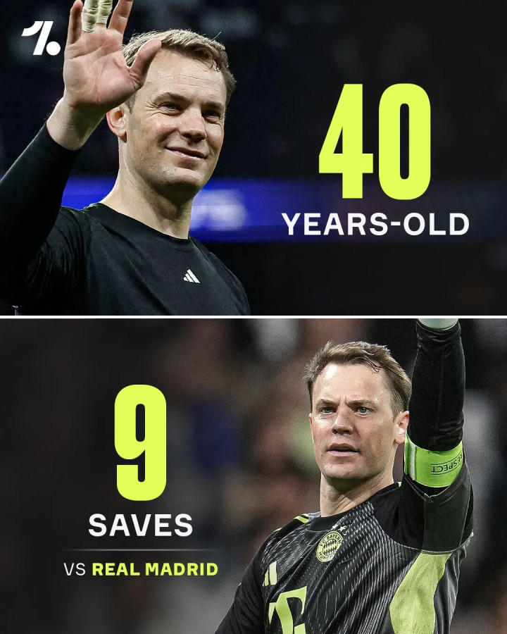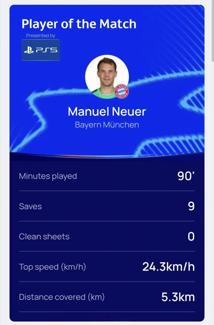 40岁的曼努埃尔·诺伊尔在对阵皇家马德里的比赛中作念出 9 次扑救,当选本场MVP