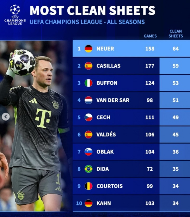 欧冠历史零封榜:诺伊尔居首,卡西、布冯、范德萨、切赫列前五