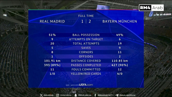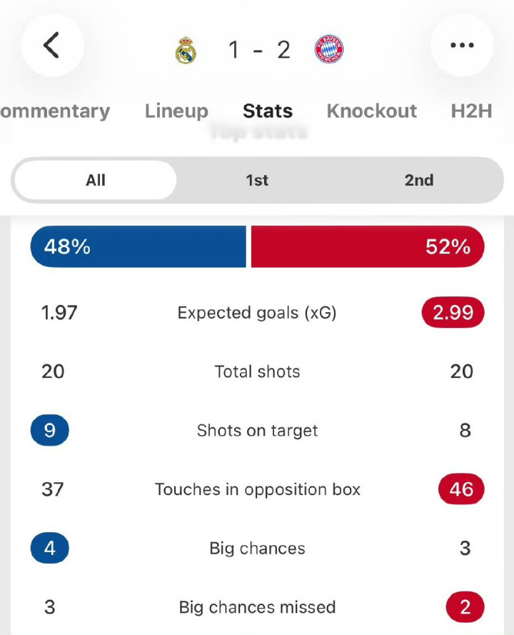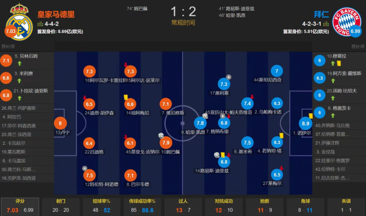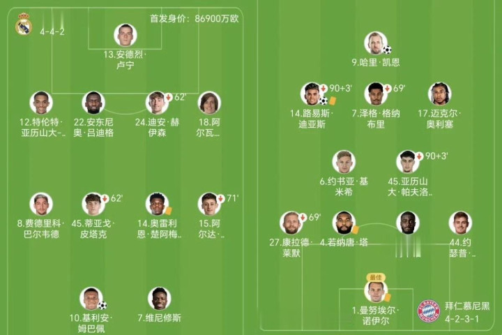 第46分钟,卡雷拉斯被帕夫洛维奇断球,奥利塞冲突架炮,凯恩禁区外精确推杆破门,皇马0-2拜仁。
