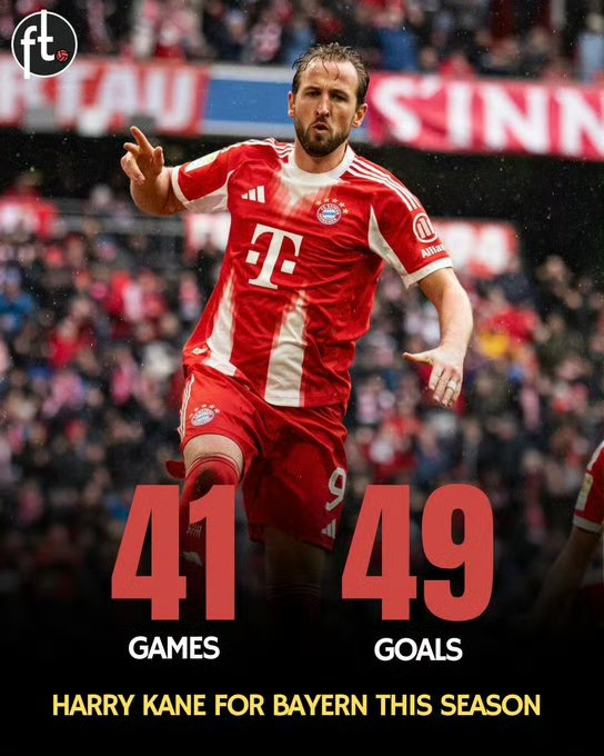 哈里·凯恩本赛季于今已为拜仁慕尼黑出场41次,攻入49球。