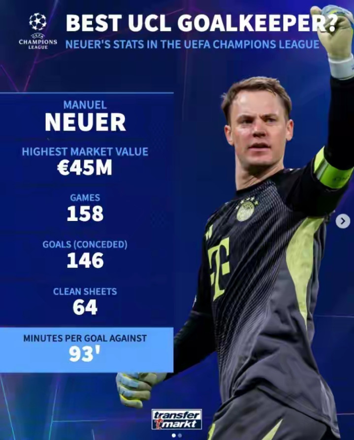 德转列诺伊尔欧冠数据:158场丢146球,64零封+每93分钟丢1球