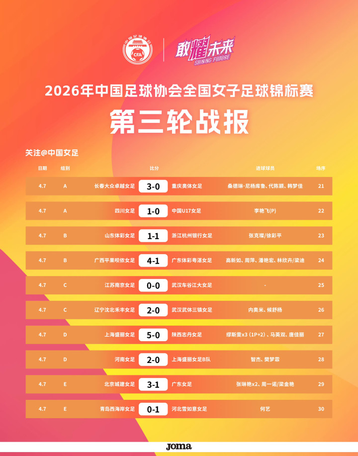 2026年中国足球协会世界女子足球锦标赛小组赛第三轮已于4月7日在广东珠海、佛山两地凯旋截至。