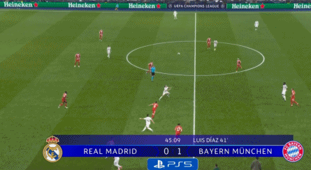 第41分钟,维尼修斯传球演叨,格纳布里直塞,迪亚斯从容推射平直,皇马0-1拜仁。