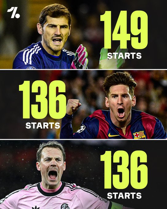 曼努埃尔·诺伊尔现在与莱昂内尔·梅西比肩欧冠首发次数第二多