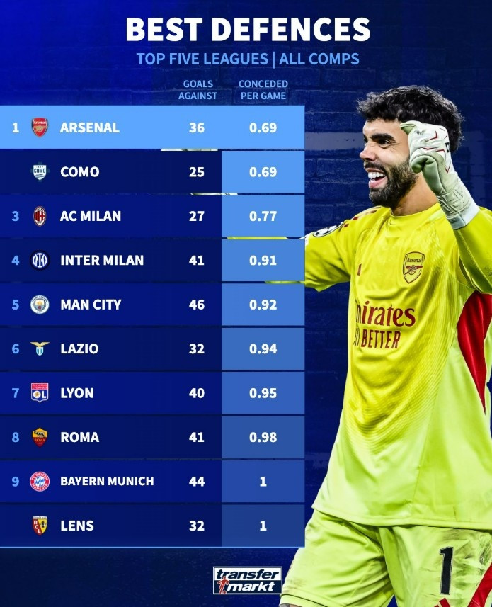 德转清点了本赛季五大联赛球队在各项赛事场均丢球最少榜单,阿森纳与科莫比肩最少