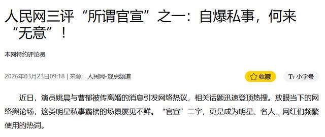 2026年3 月23日,距离她官宣离异,刚好曩昔七天,东说念主民网发布批驳著作《三评 “所谓官宣” 之一:自爆私务,何来 “意外”!》,整篇批驳,莫得点名症结个东说念主品行,莫得翻炒私情面感旧账,但句句精确,直击关键,径直掀起她此次离异的整个体面外壳。